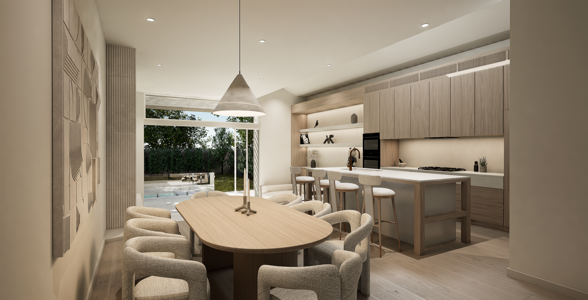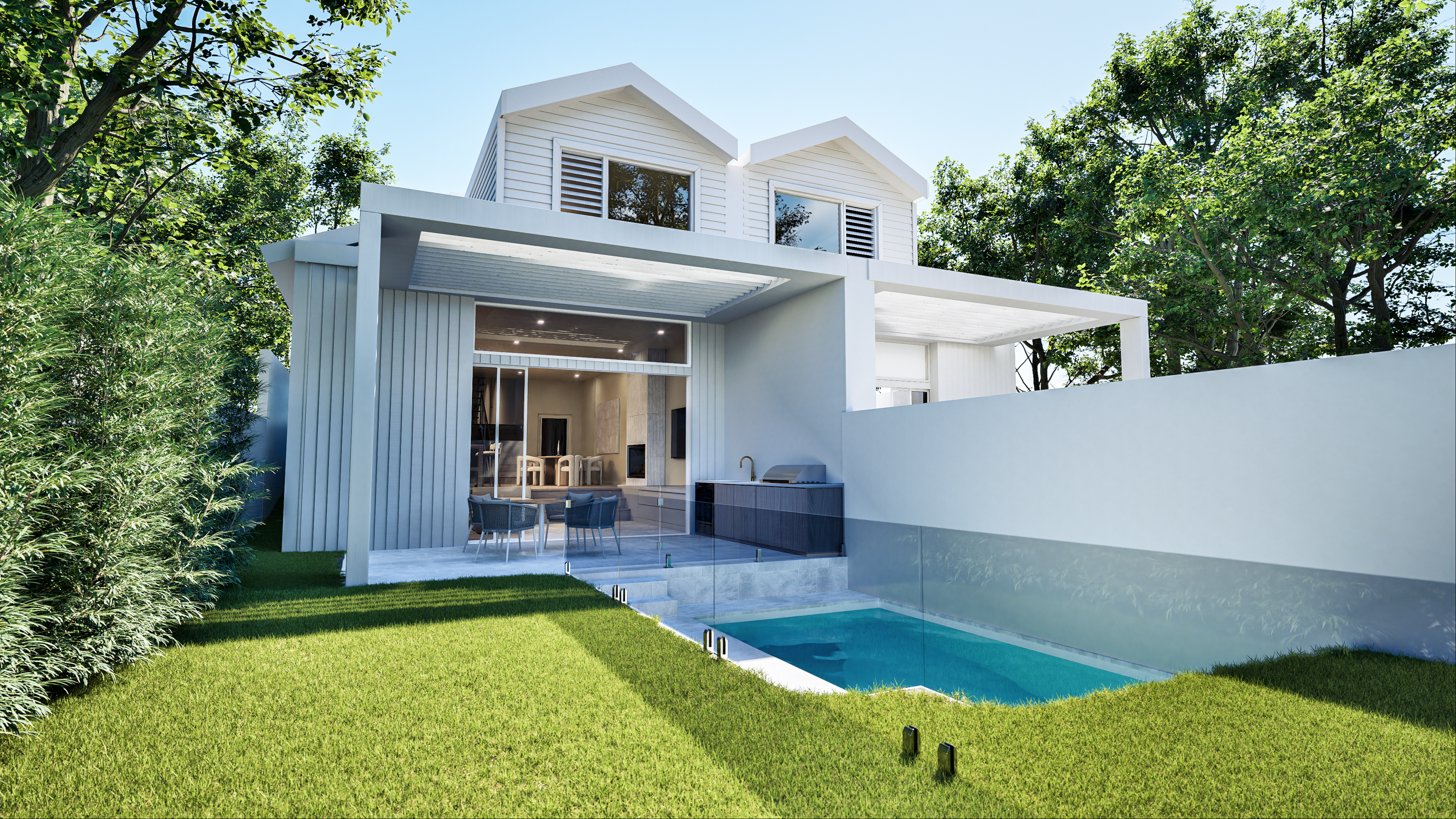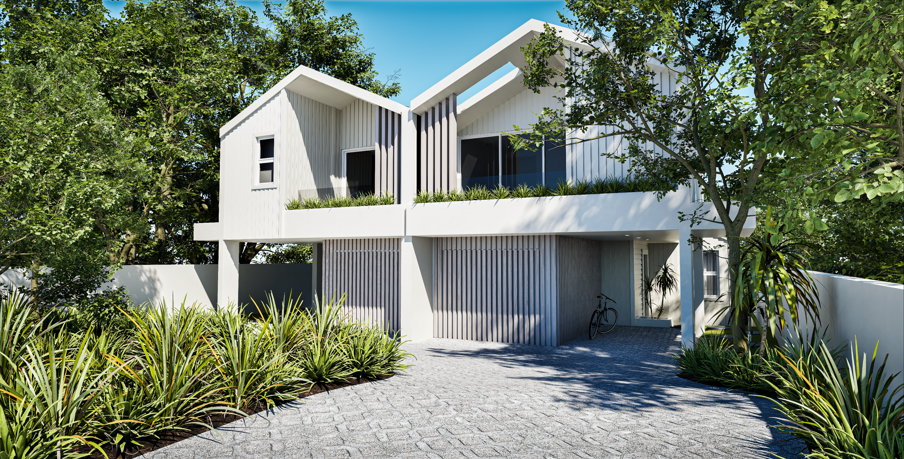 The elevation of the house boasts clean, sharp roof lines and two symmetrical front gables, each adorned with expansive side-by-side balconies, reflecting the essence of a dual occupancy development. The two elevations, while similar in overall structure, diverge in intricate details. Bespoke architectural elements, such as vertical and horizontal boards, are thoughtfully introduced to infuse visual interest and rhythm into the design, giving this home a unique and charming character.