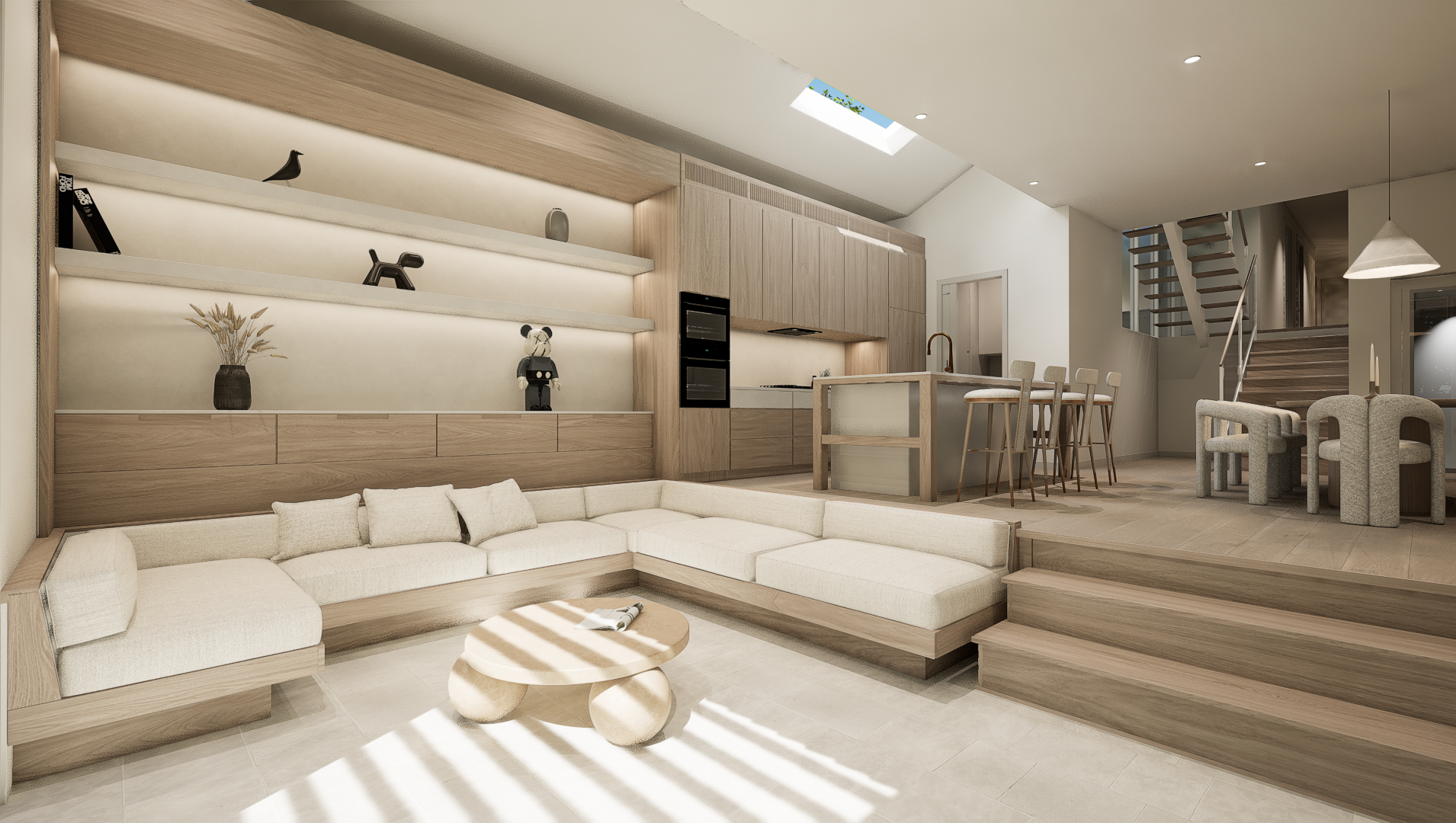 This split-level design seamlessly follows the natural contours of the topography. A landscaped courtyard, featuring a circulation staircase, serves as the focal point, uniting the two distinct living areas. This design not only promotes an abundance of natural light, greenery, and ventilation but also integrates these elements deep into the interior spaces.